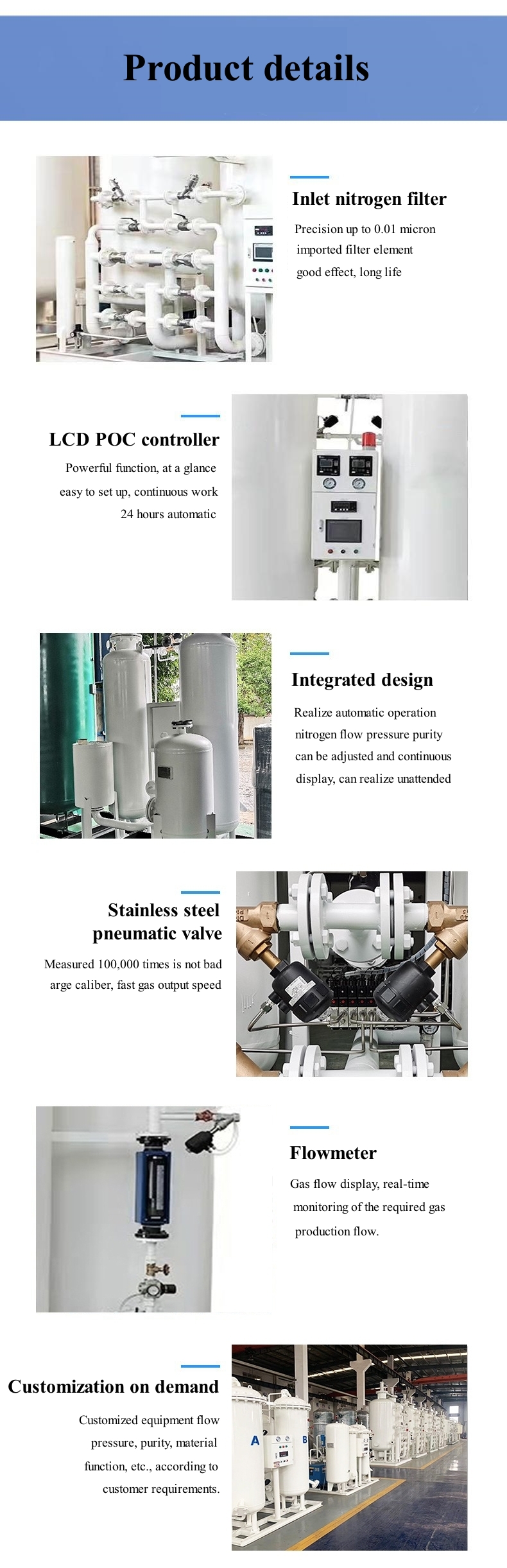 Our PSA Nitrogen Generator has many advantages, such as high purity, simple process, full automation, low